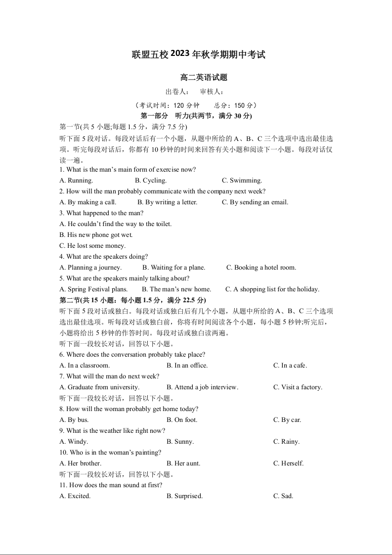江苏省泰州市联盟五校2023-2024学年高二上学期期中考试英语