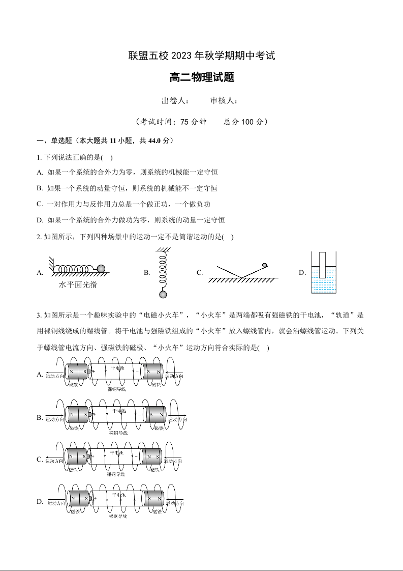 江苏省泰州市联盟五校2023-2024学年高二上学期期中考试物理