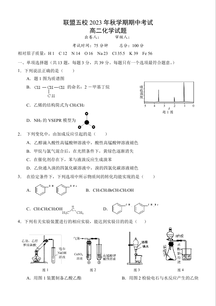 江苏省泰州市联盟五校2023-2024学年高二上学期期中考试化学+答案
