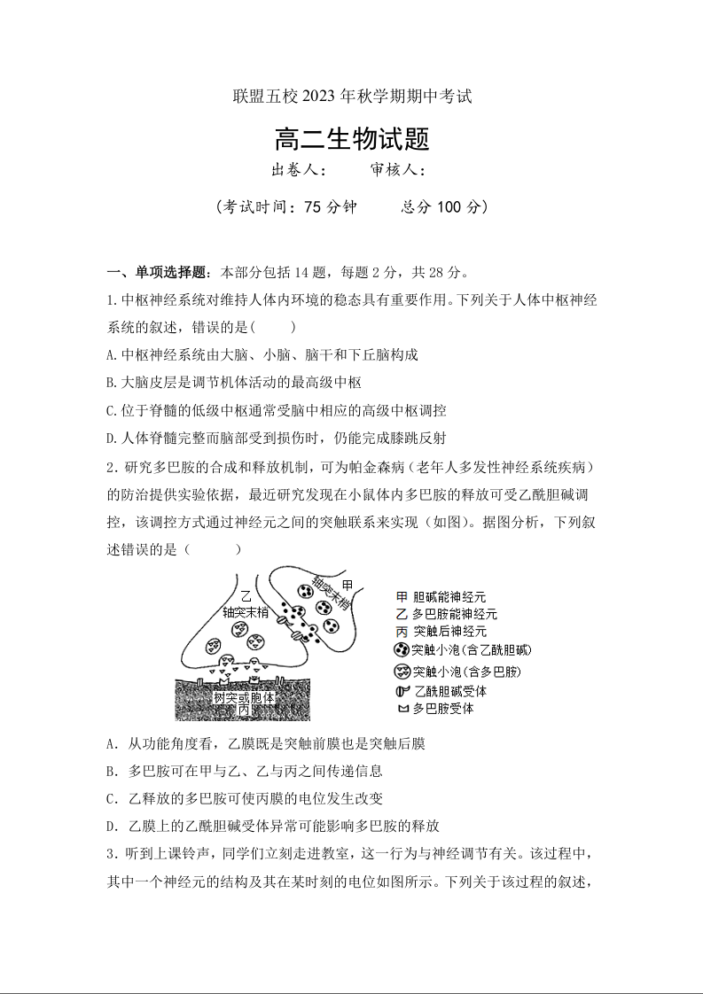 江苏省泰州市联盟五校2023-2024学年高二上学期期中考试生物