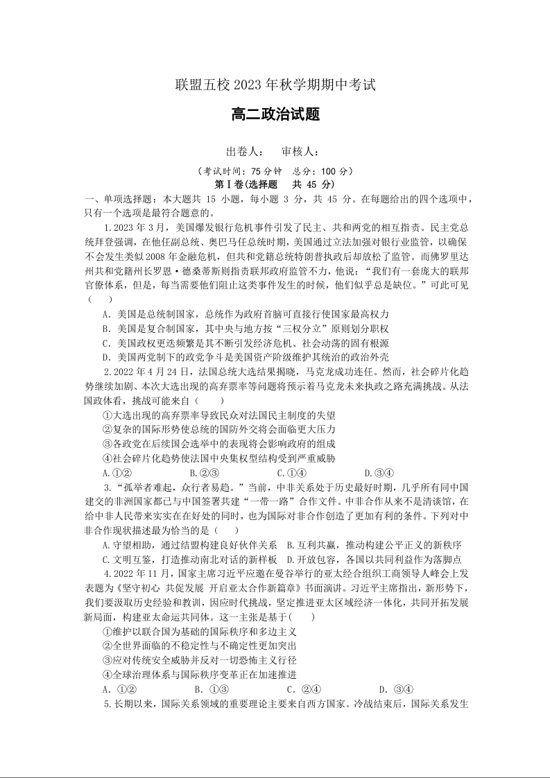江苏省泰州市联盟五校2023-2024学年高二上学期期中考试政治