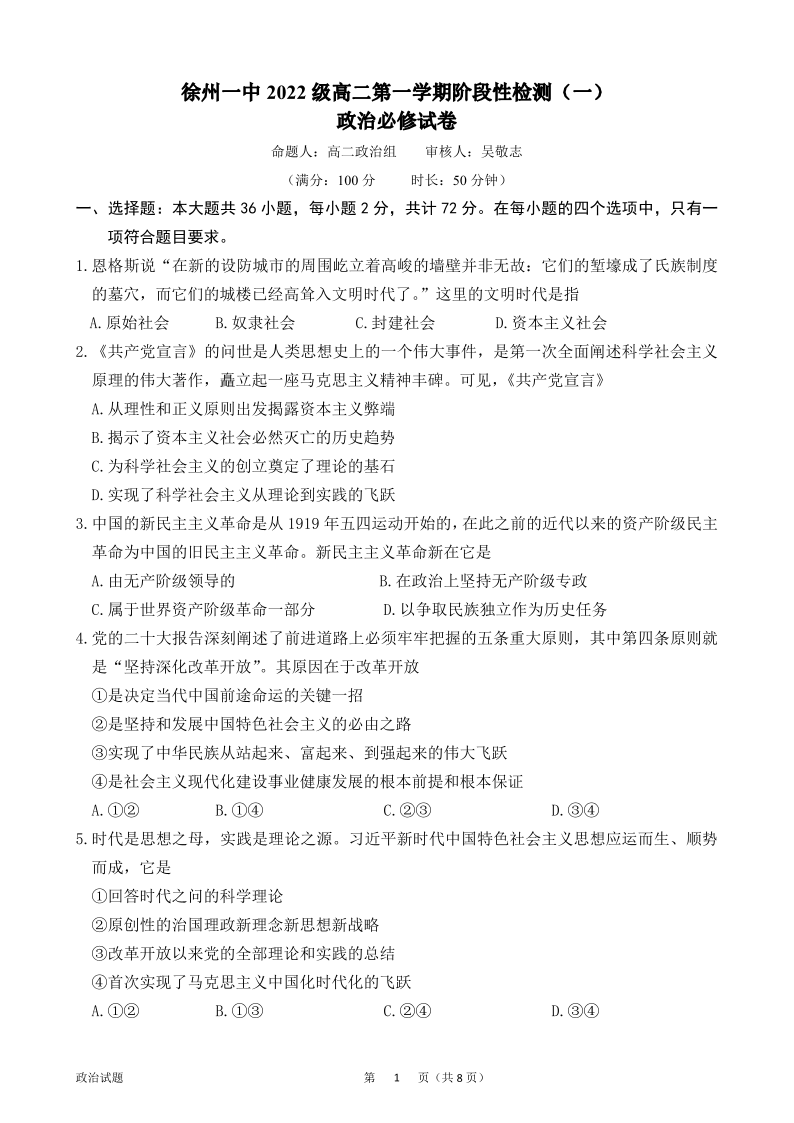 江苏省徐州市第一中学2023-2024学年高二上学期第一次阶段性检测政治