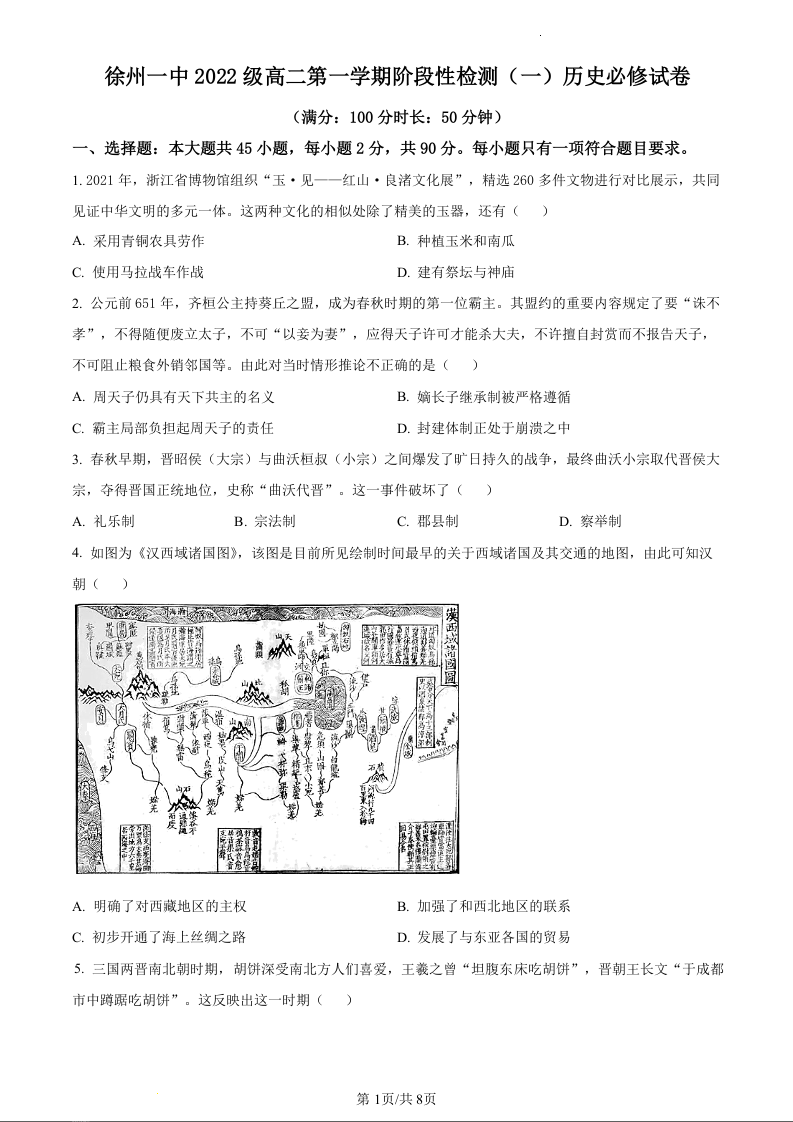 江苏省徐州市第一中学2023-2024学年高二上学期第一次阶段性检测历史(原卷版)