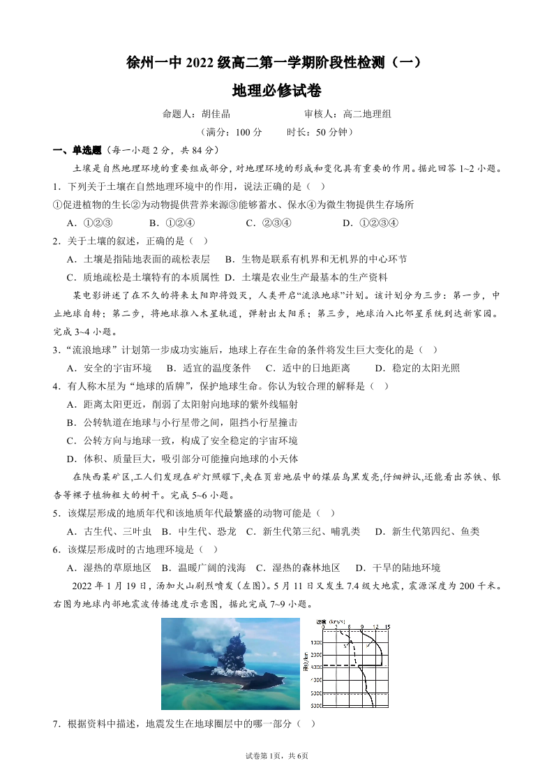江苏省徐州市第一中学2023-2024学年高二上学期第一次阶段性检测地理
