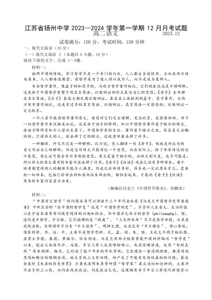 江苏省扬州中学2023-2024学年高二上学期12月月考语文+答案
