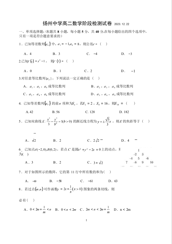 江苏省扬州中学2023-2024学年高二上学期12月月考数学+答案