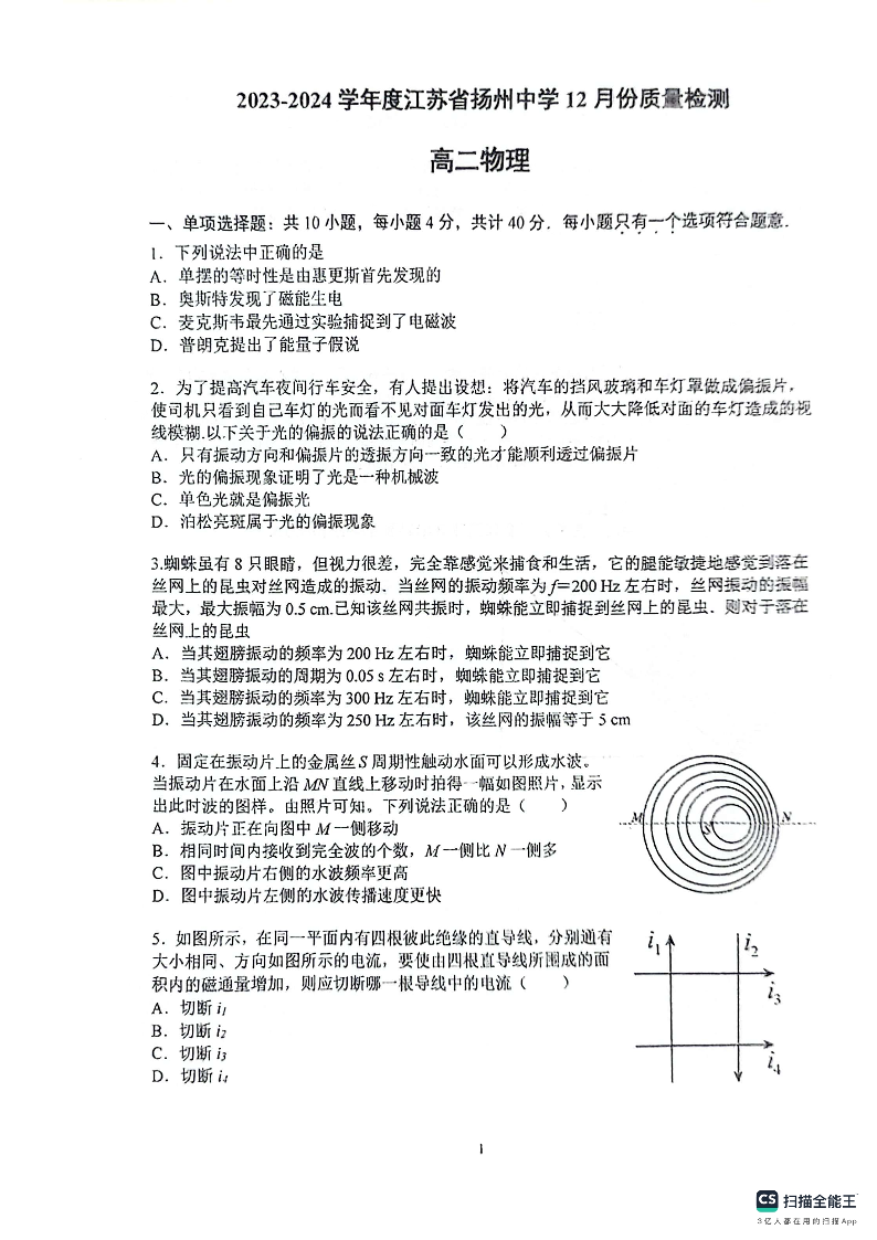 江苏省扬州中学2023-2024学年高二上学期12月月考物理