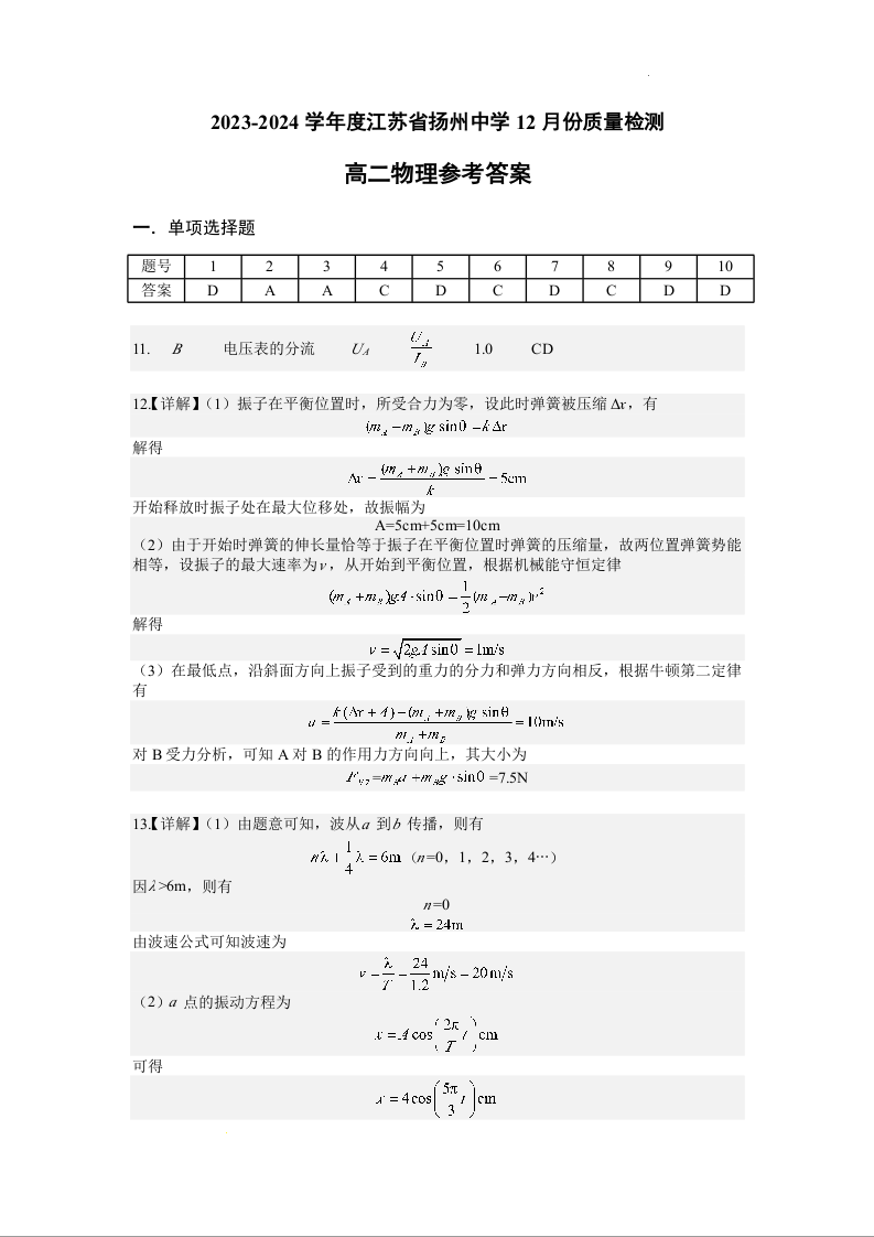 江苏省扬州中学2023-2024学年高二上学期12月月考物理答案