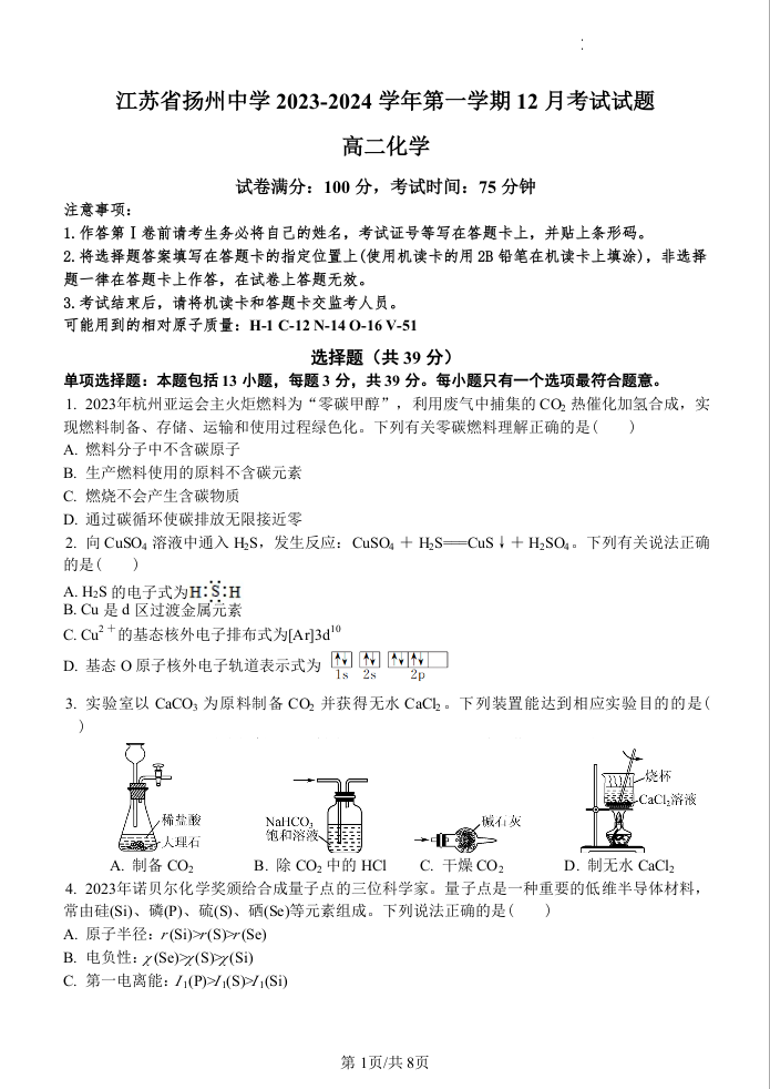 江苏省扬州中学2023-2024学年高二上学期12月月考化学