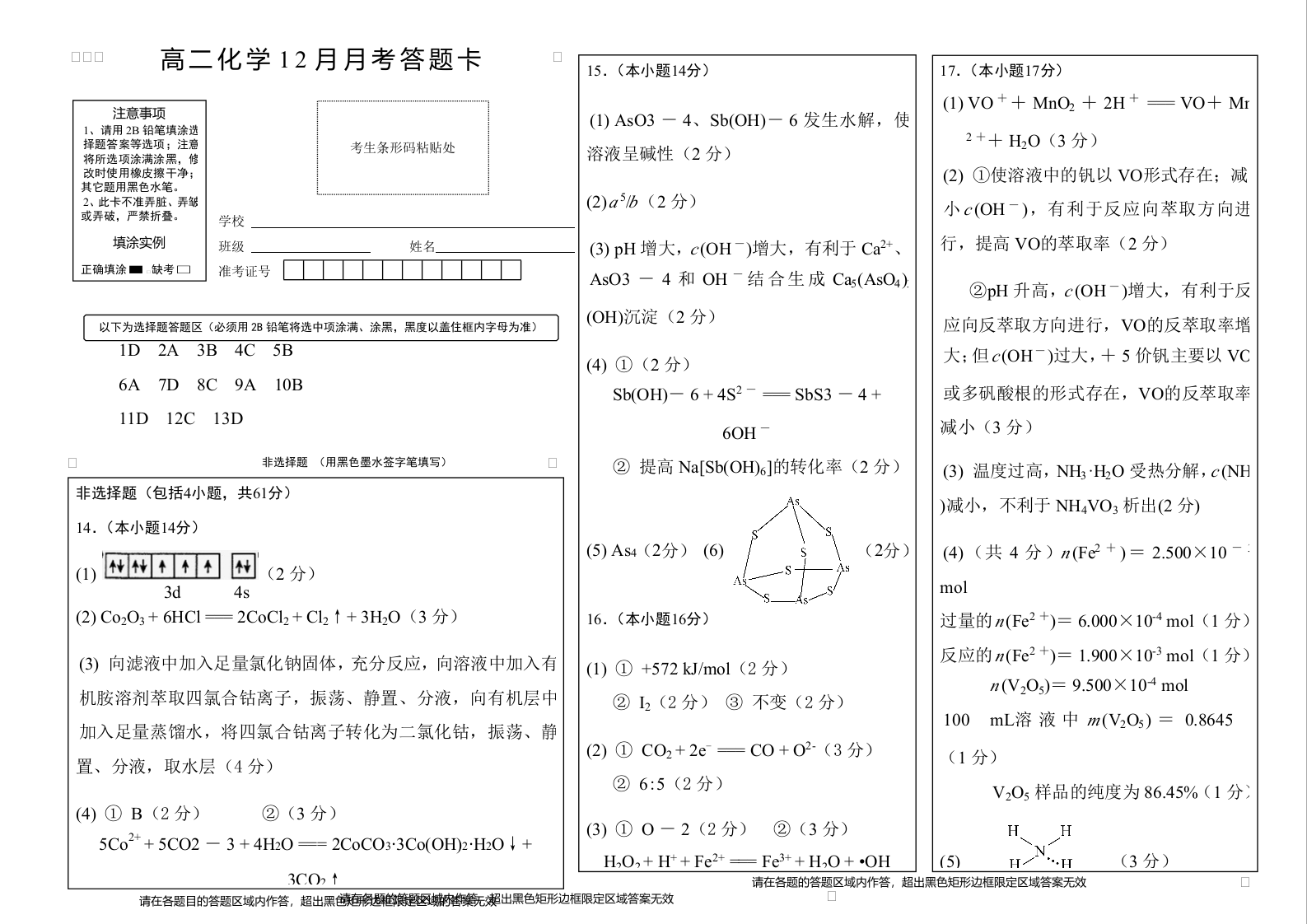江苏省扬州中学2023-2024学年高二上学期12月月考化学答案