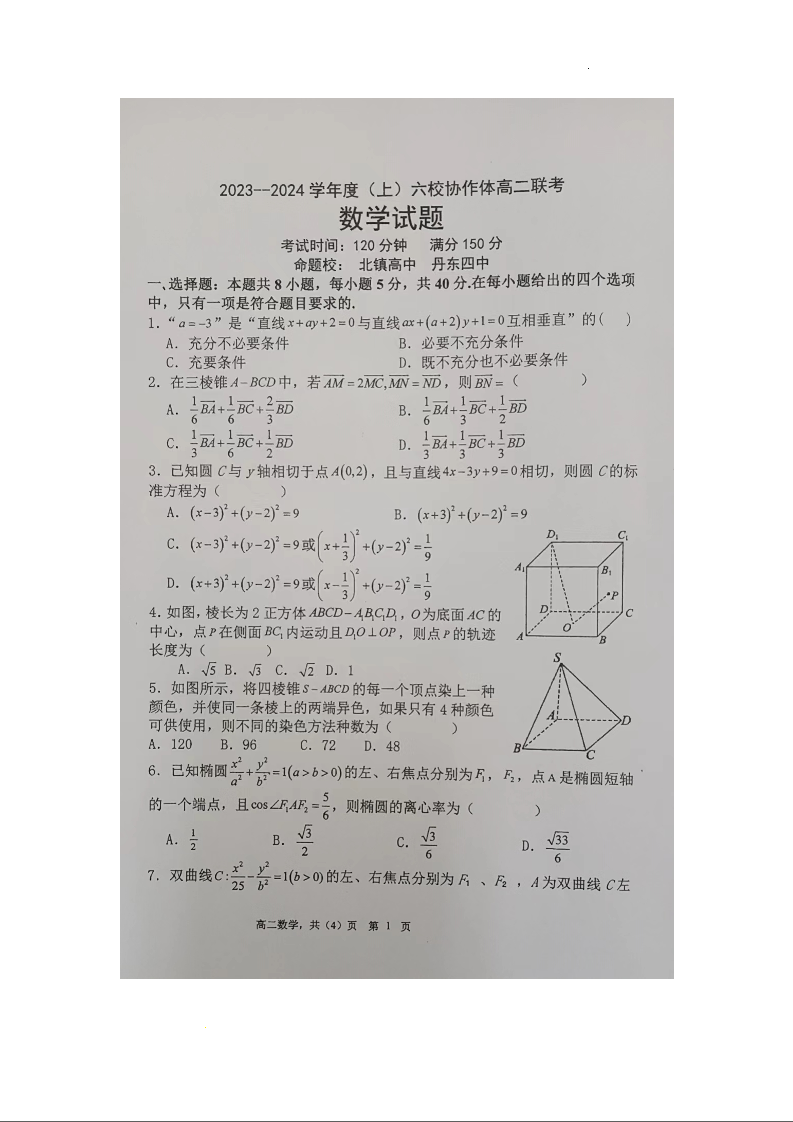 辽宁省六校协作体2023-2024学年高二上学期12月月考数学