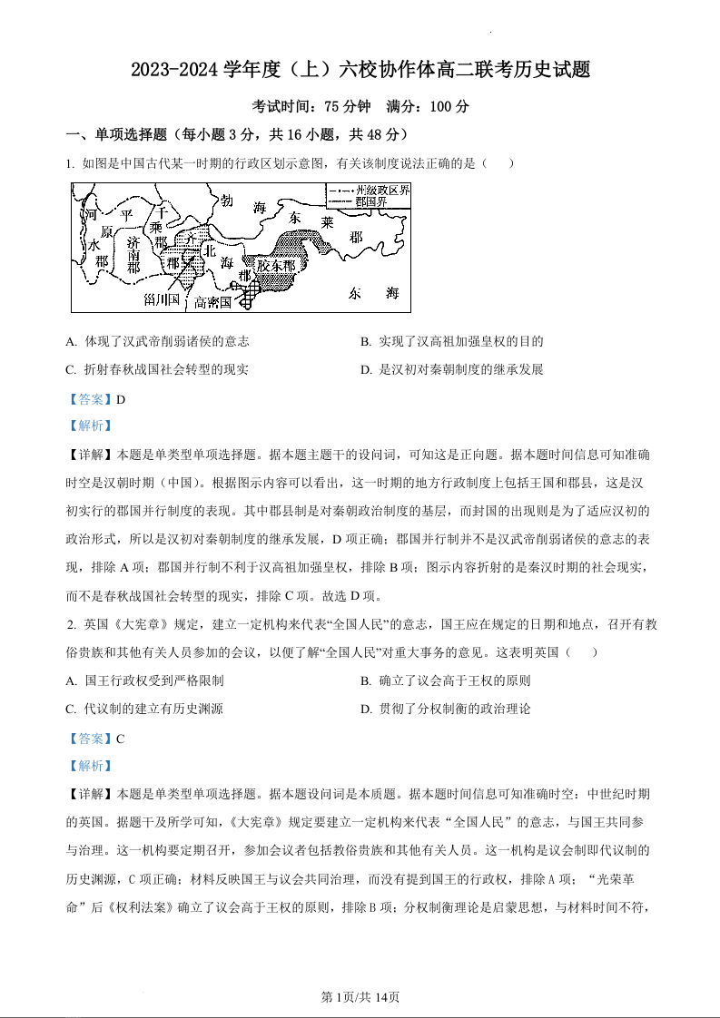 辽宁省六校协作体2023-2024学年高二上学期12月月考历史(精品解析版)