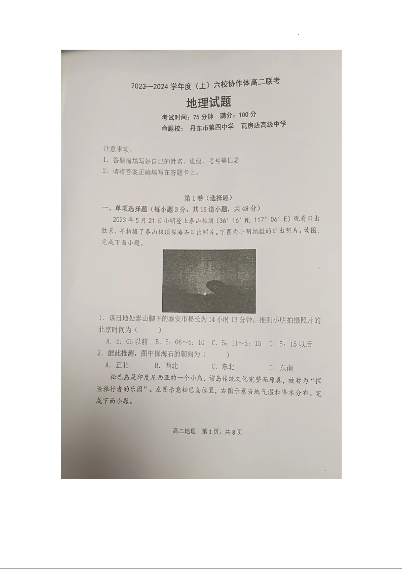 辽宁省六校协作体2023-2024学年高二上学期12月月考地理