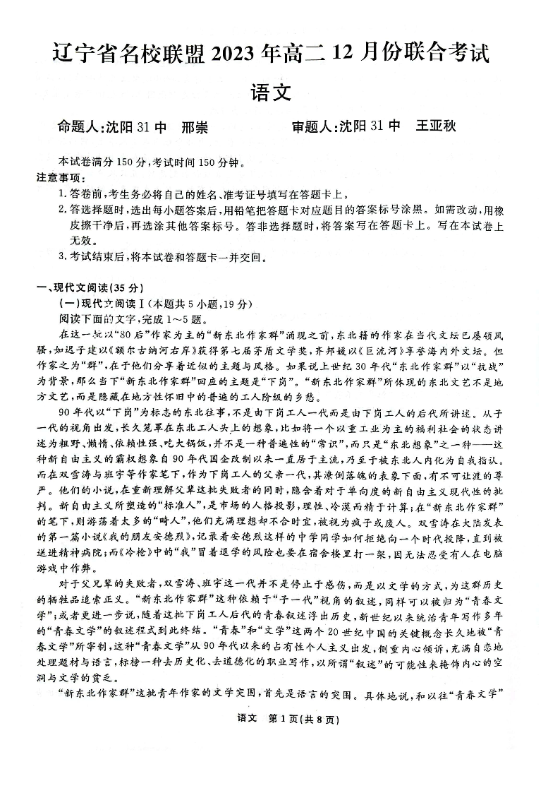 辽宁省名校联盟2023-2024学年高二上学期12月月考语文