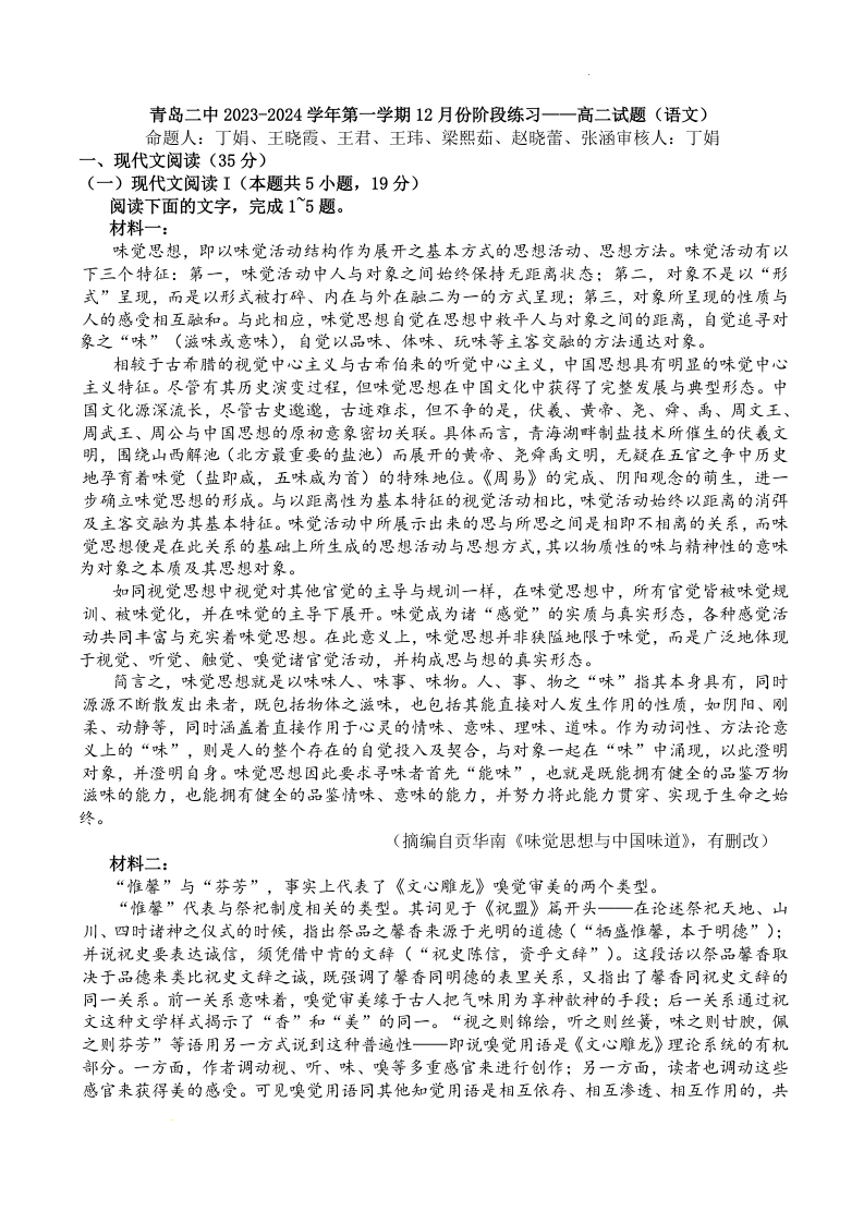 山东省青岛市第二中学2023-2024学年高二上学期12月月考语文