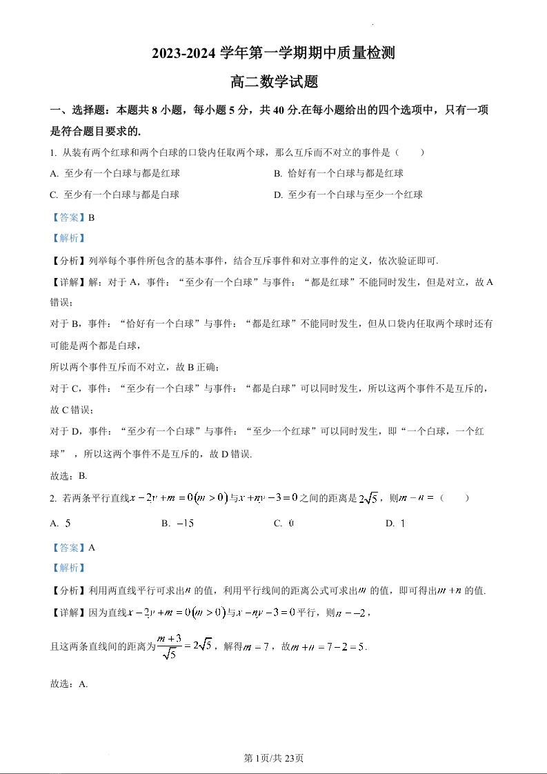 山东省济宁市兖州区2023-2024学年高二上学期期中考试数学(精品解析版)