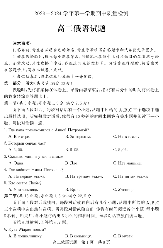 山东省济宁市兖州区2023-2024学年高二上学期期中考试俄语