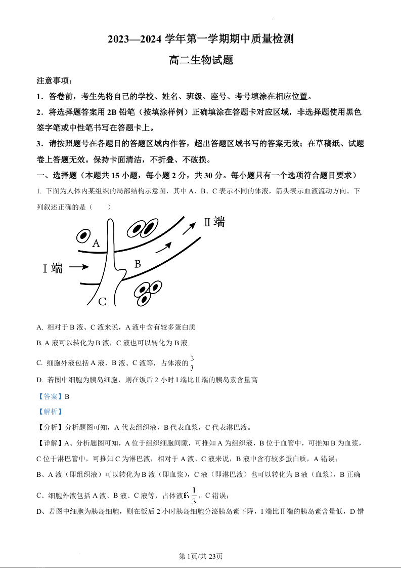 山东省济宁市兖州区2023-2024学年高二上学期期中考试生物(精品解析版)