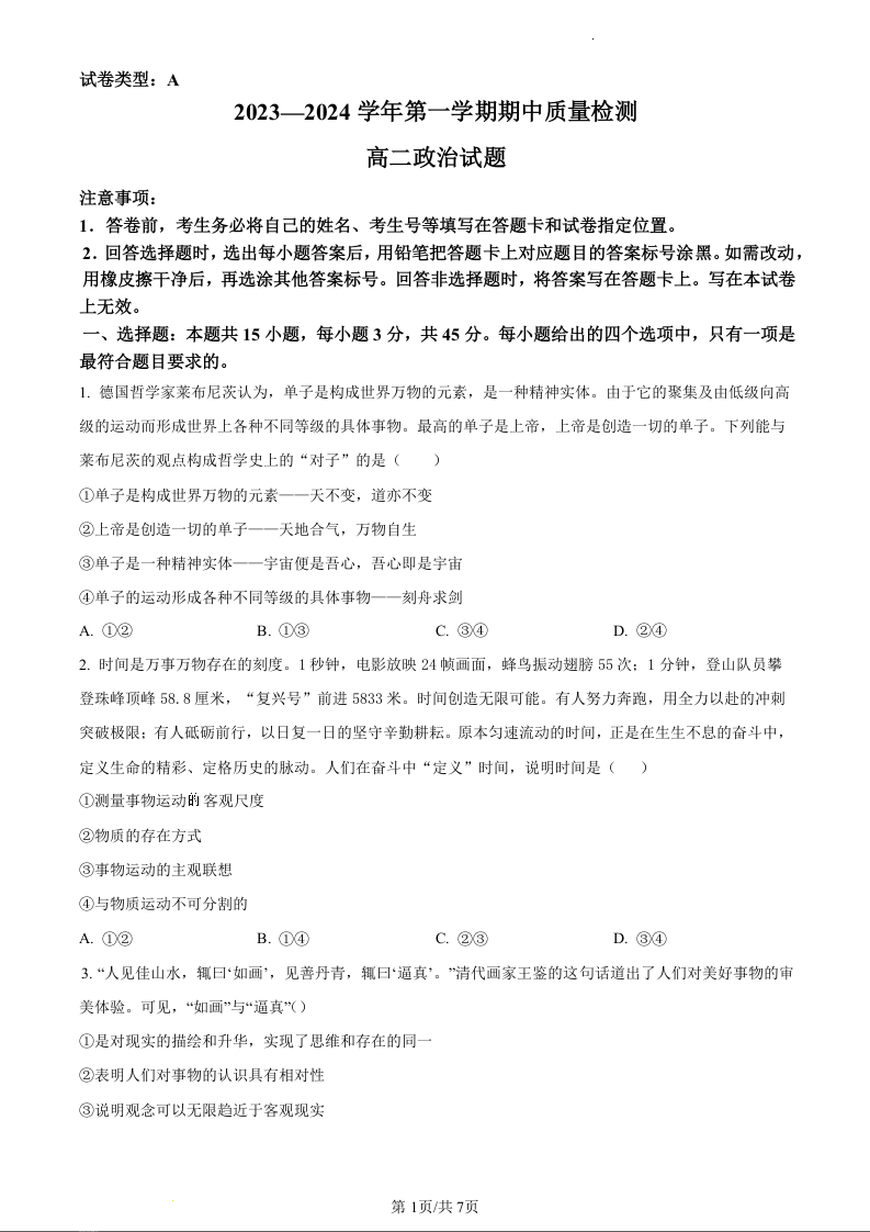 山东省济宁市兖州区2023-2024学年高二上学期期中考试政治(原卷版)