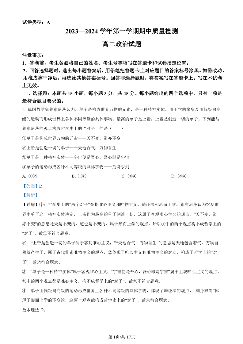山东省济宁市兖州区2023-2024学年高二上学期期中考试政治(精品解析版)