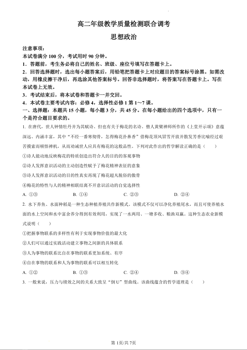 山东省省级联考2023-2024学年高二上学期12月月考政治(原卷版)
