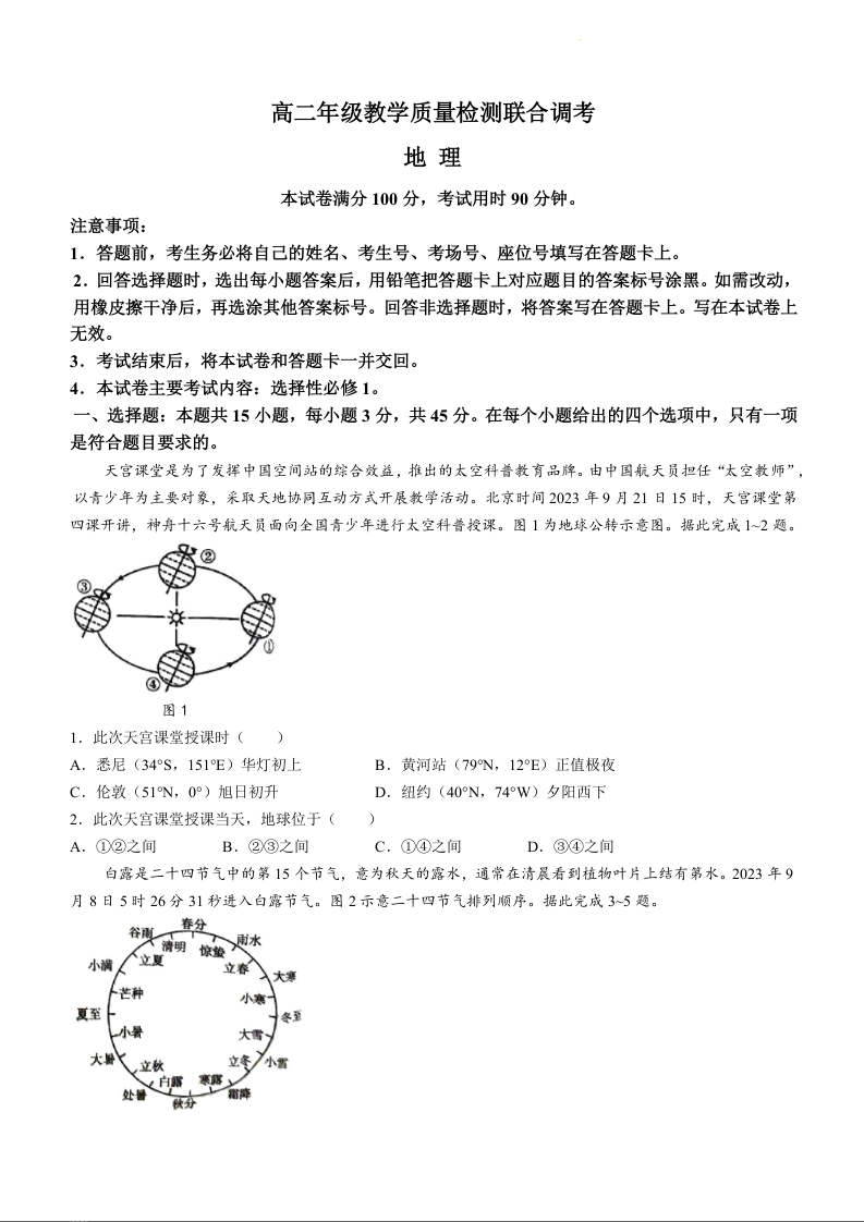 山东省省级联考2023-2024学年高二上学期12月月考地理