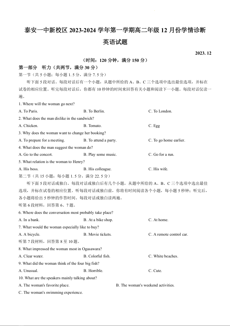 山东省泰安第一中学2023-2024学年高二上学期12月月考英语