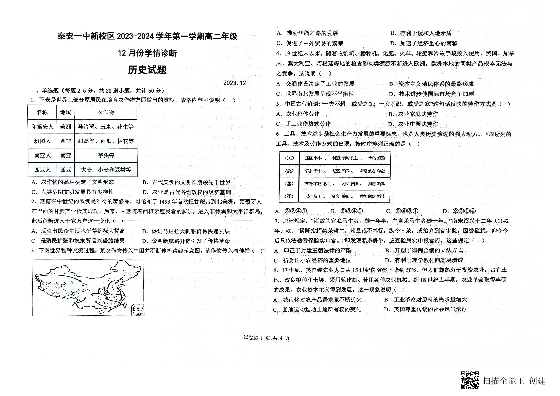 山东省泰安第一中学2023-2024学年高二上学期12月月考历史+答案
