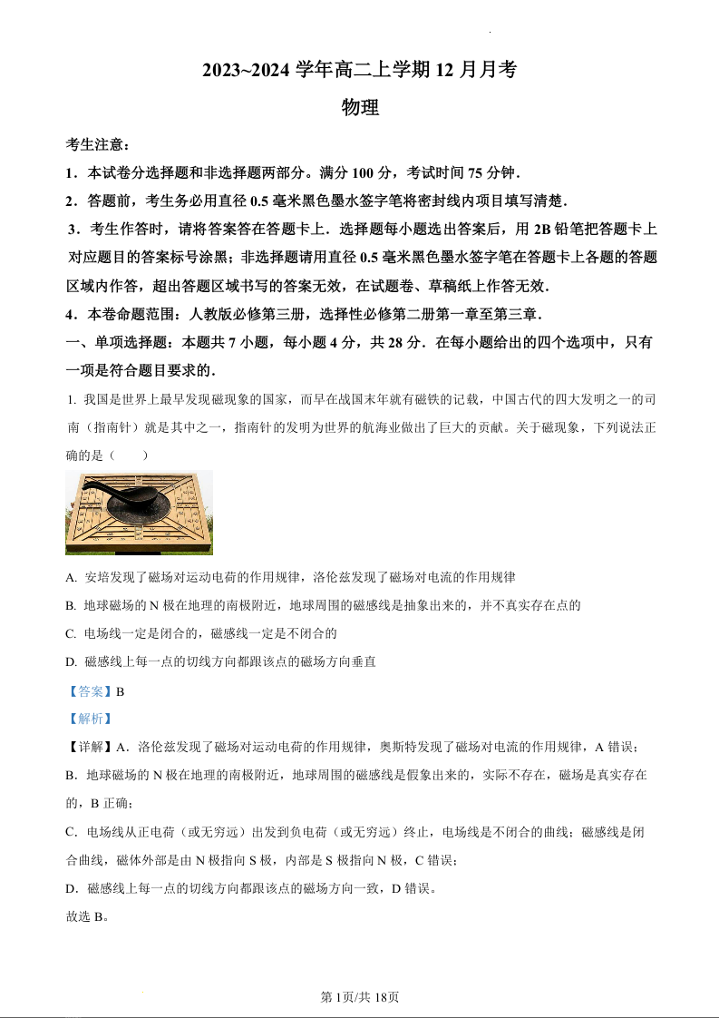 山西省吕梁市孝义市多校2023-2024学年高二上学期12月月考物理(精品解析版)