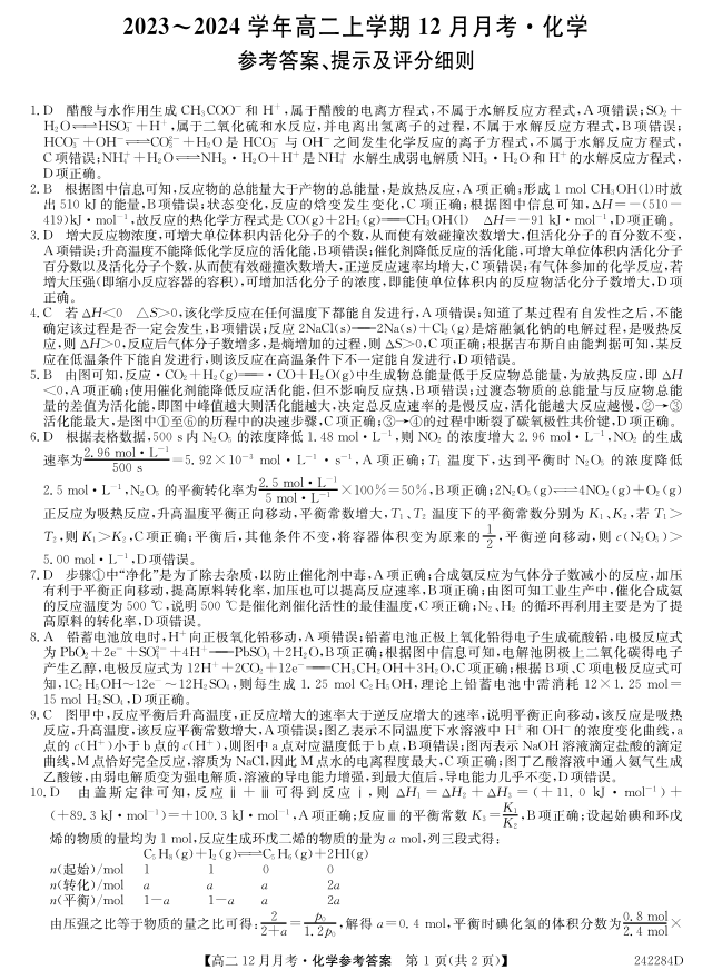 山西省吕梁市孝义市多校2023-2024学年高二上学期12月月考化学答案