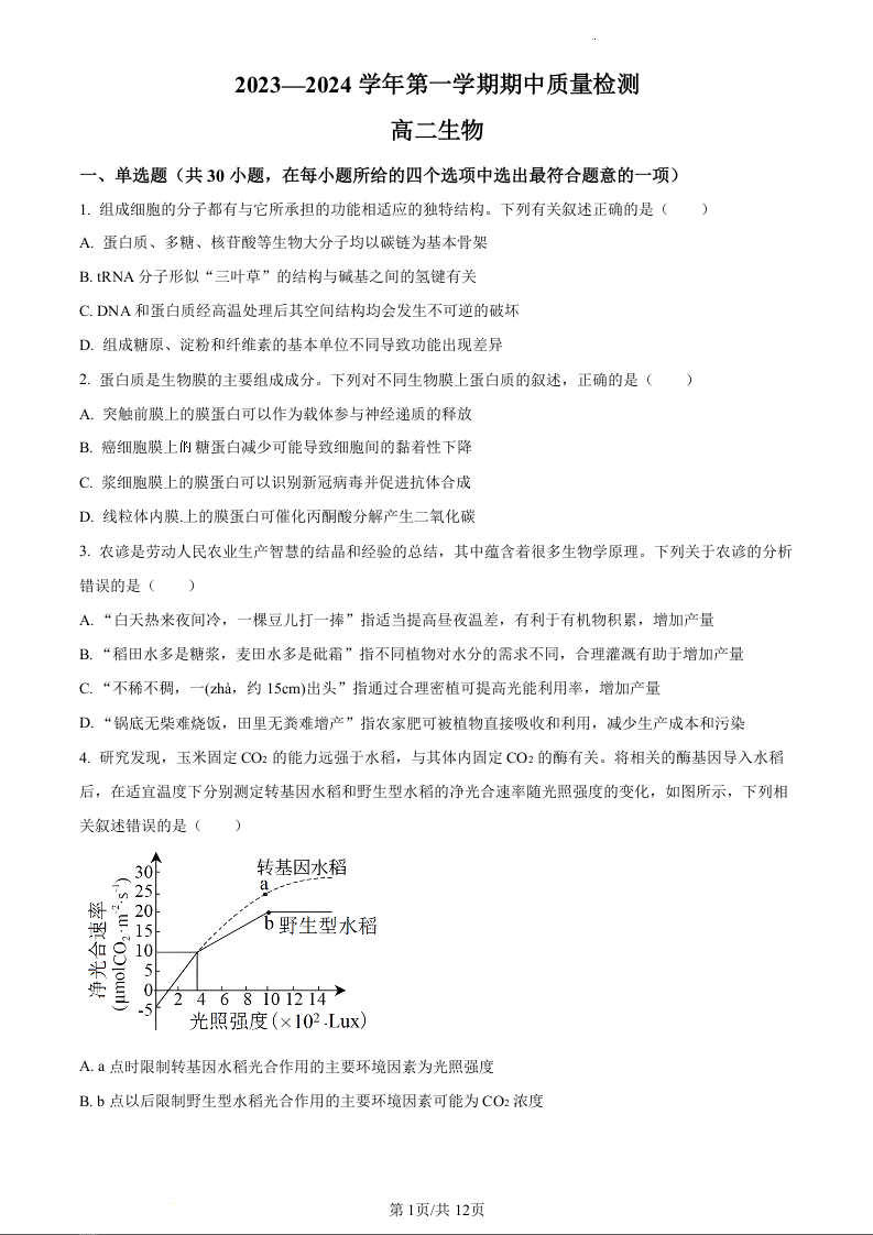陕西省西安市西北工业大学附属中学2023-2024学年高二上学期期中考试生物(原卷版)