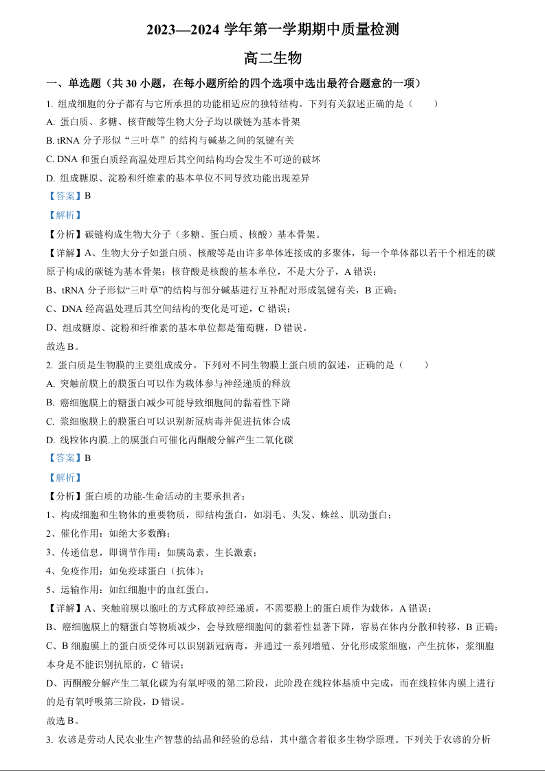 陕西省西安市西北工业大学附属中学2023-2024学年高二上学期期中考试生物(精品解析版)