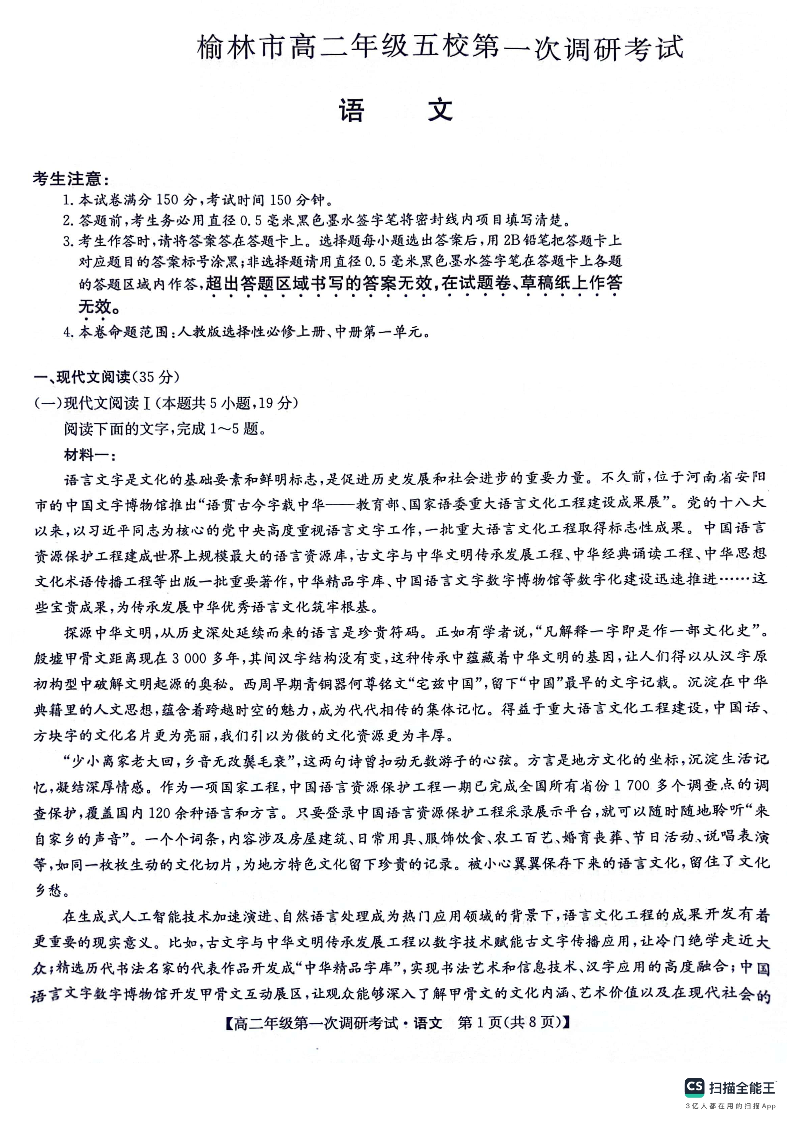 陕西省榆林市五校联考2023-2024学年高二上学期12月月考语文
