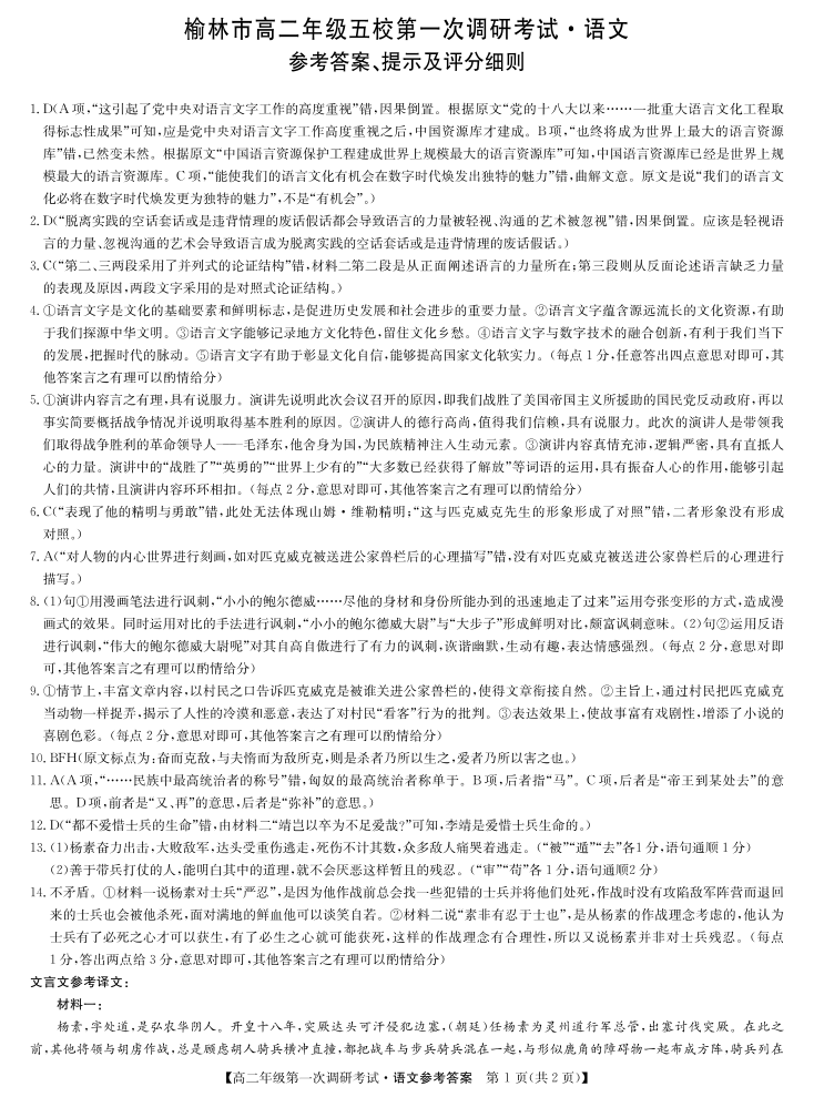 陕西省榆林市五校联考2023-2024学年高二上学期12月月考语文答案