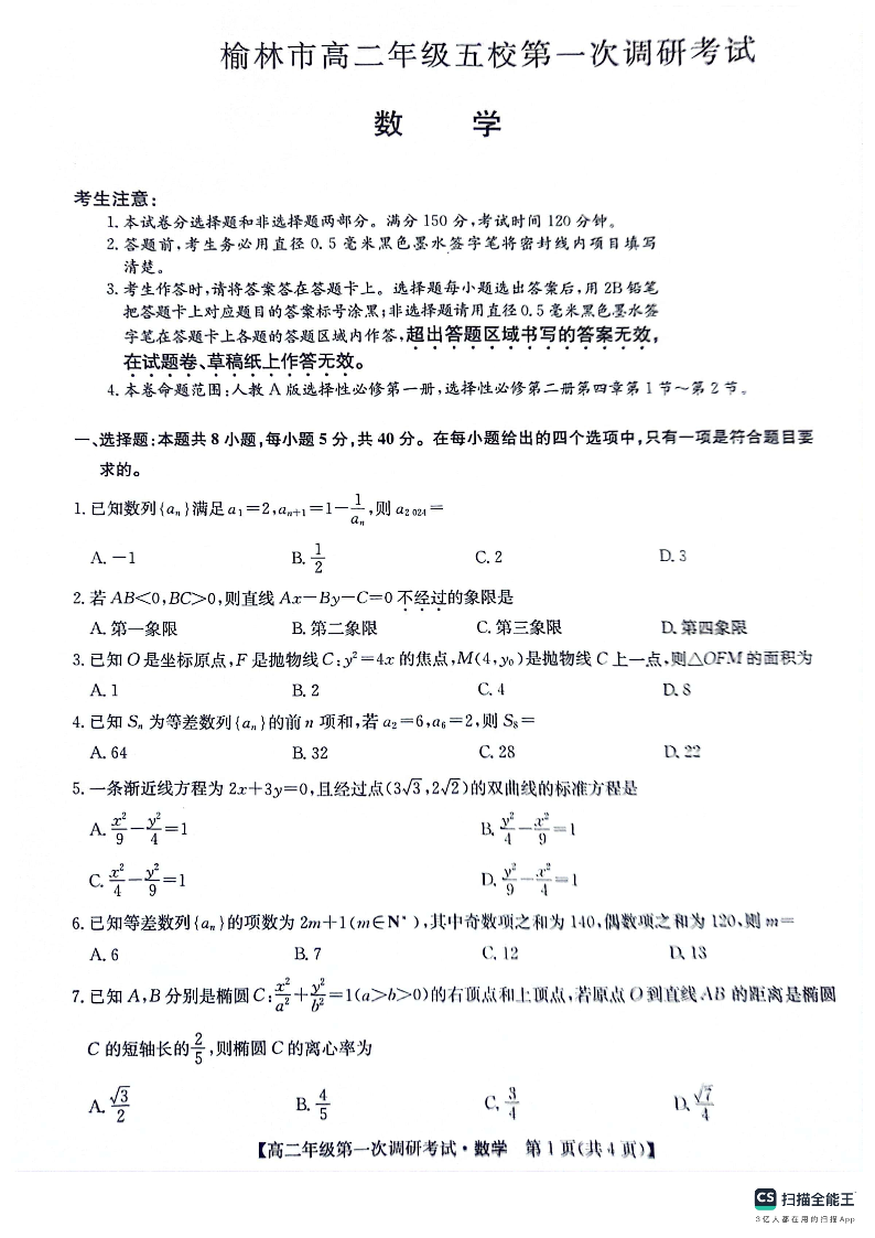 陕西省榆林市五校联考2023-2024学年高二上学期12月月考数学