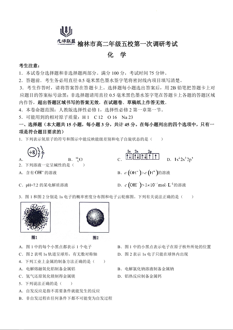 陕西省榆林市五校联考2023-2024学年高二上学期12月月考化学+答案