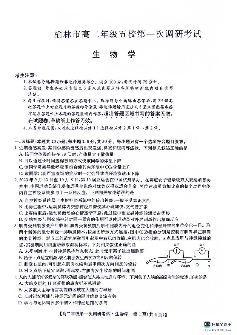 陕西省榆林市五校联考2023-2024学年高二上学期12月月考生物