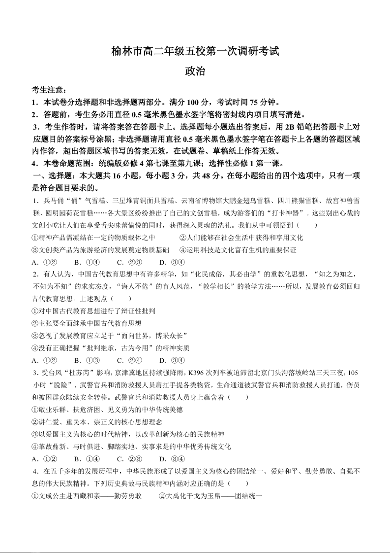 陕西省榆林市五校联考2023-2024学年高二上学期12月月考政治+答案
