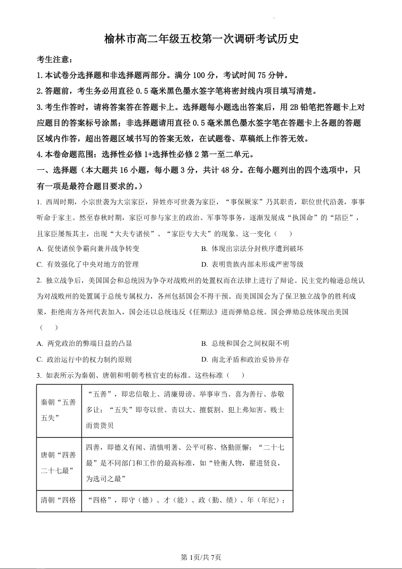 陕西省榆林市五校联考2023-2024学年高二上学期12月月考历史(原卷版)