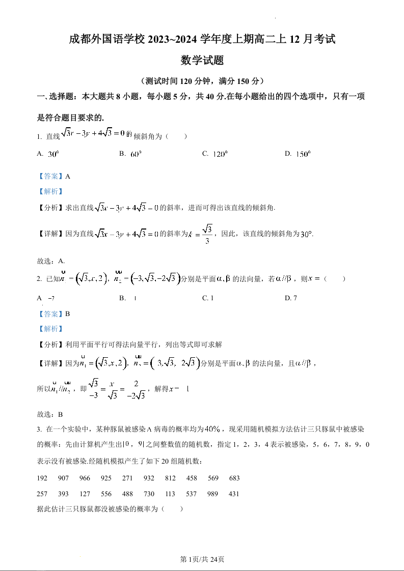 四川省成都外国语学校2023-2024学年高二上学期12月月考数学(精品解析版)