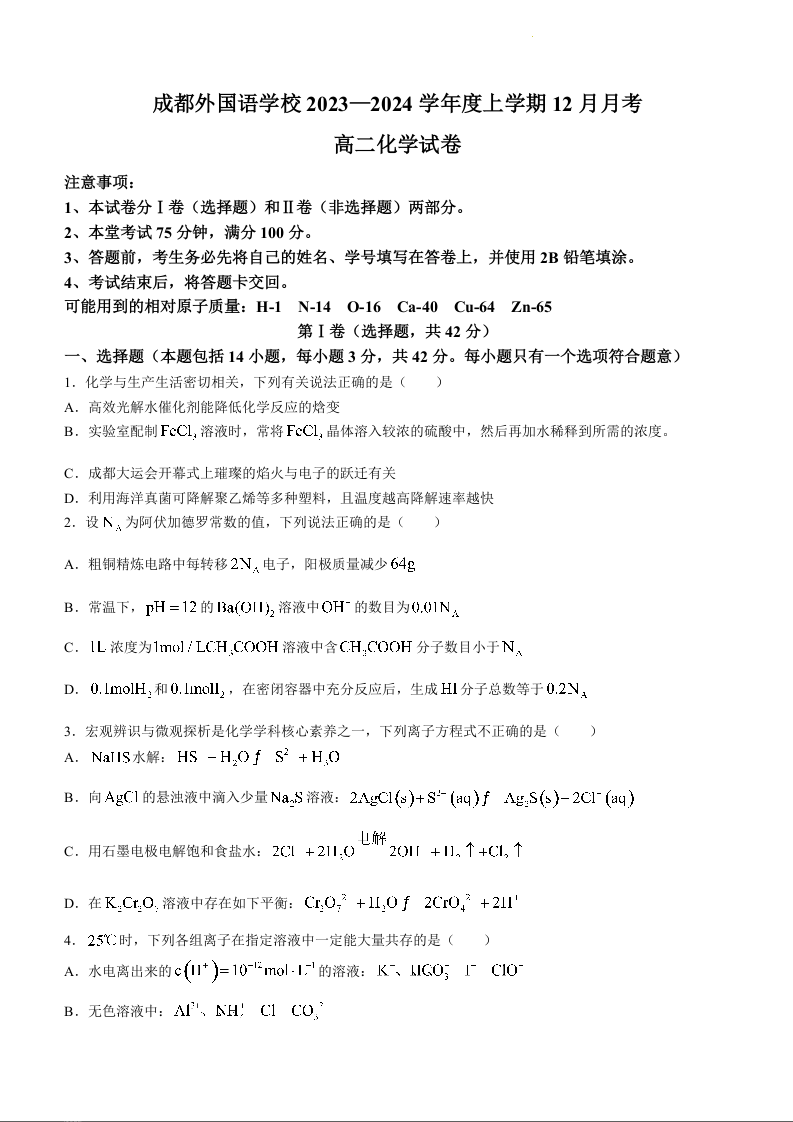 四川省成都外国语学校2023-2024学年高二上学期12月月考化学+答案