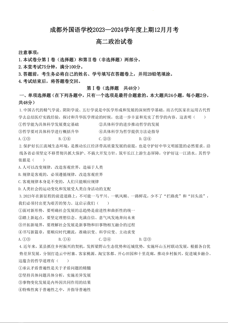 四川省成都外国语学校2023-2024学年高二上学期12月月考政治+答案