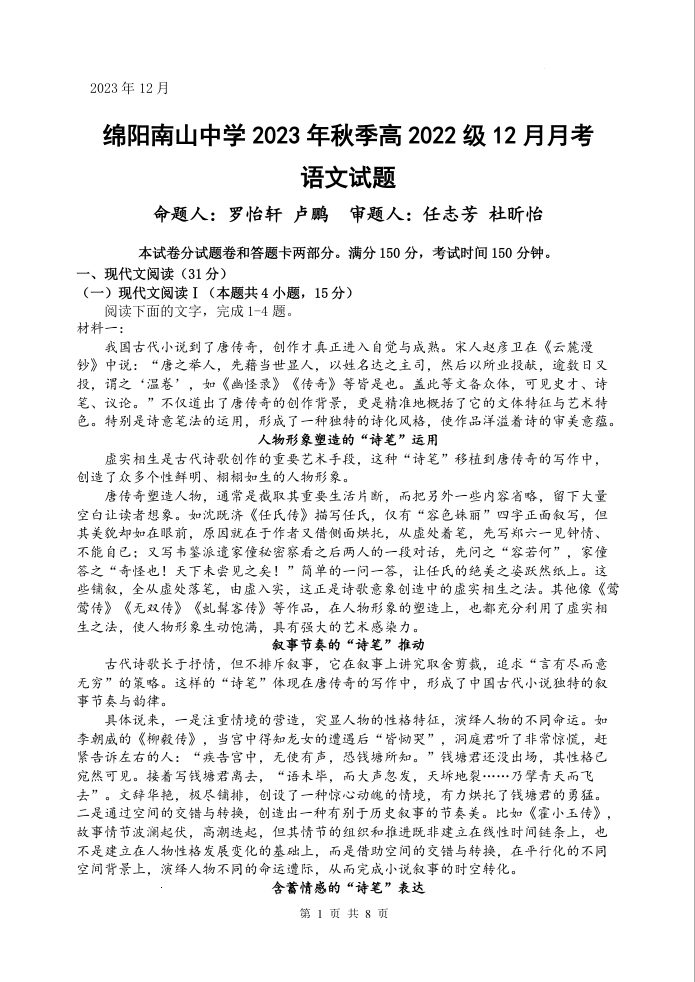 四川省绵阳市南山中学2023-2024学年高二上学期12月月考语文