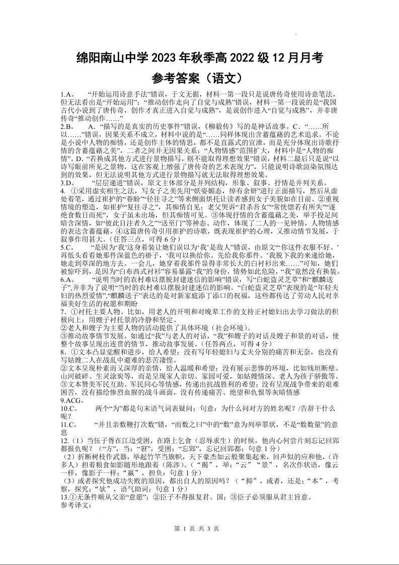 四川省绵阳市南山中学2023-2024学年高二上学期12月月考语文答案