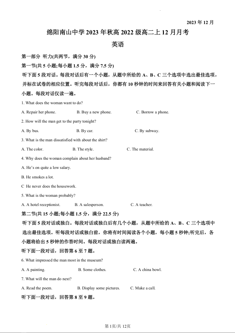 四川省绵阳市南山中学2023-2024学年高二上学期12月月考英语(原卷版)