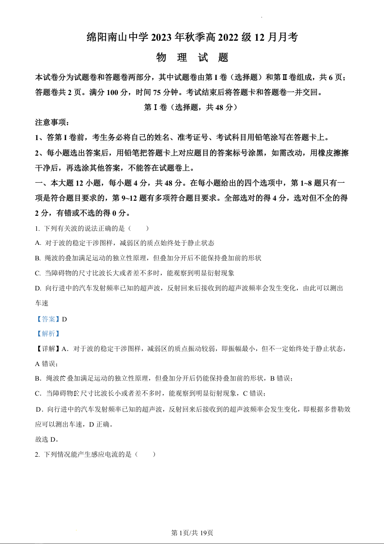 四川省绵阳市南山中学2023-2024学年高二上学期12月月考物理(精品解析版)