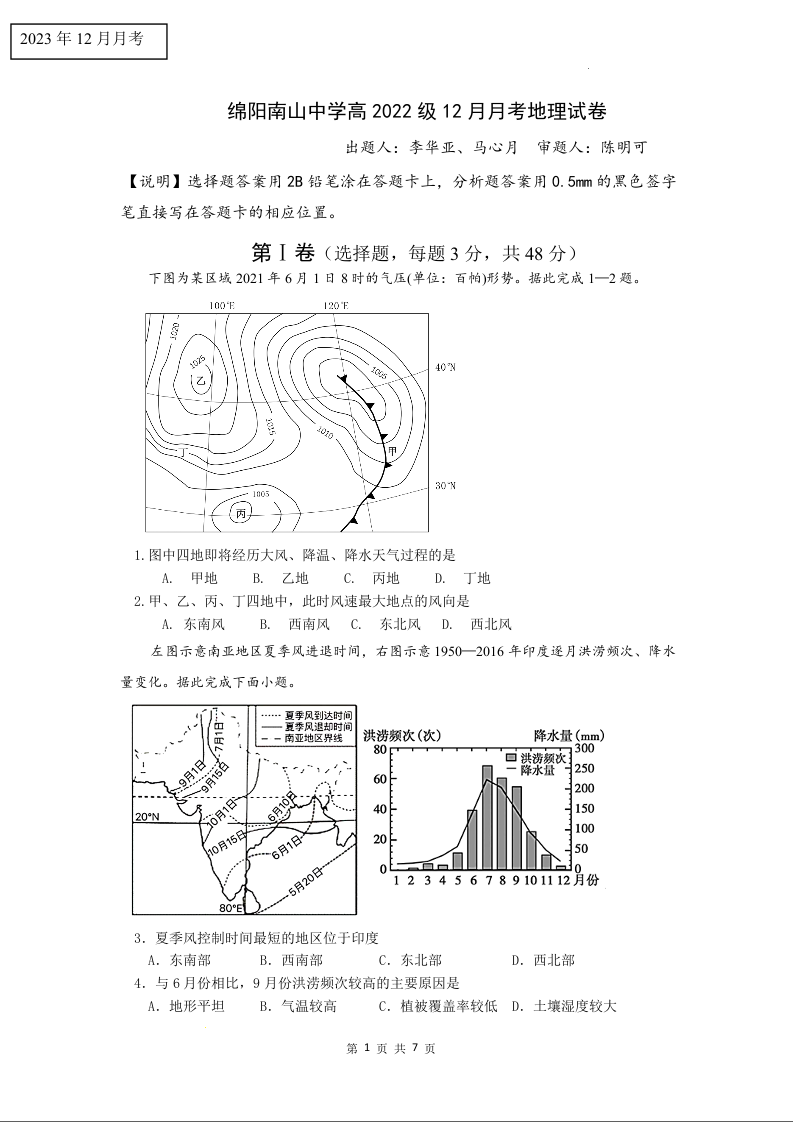 四川省绵阳市南山中学2023-2024学年高二上学期12月月考地理