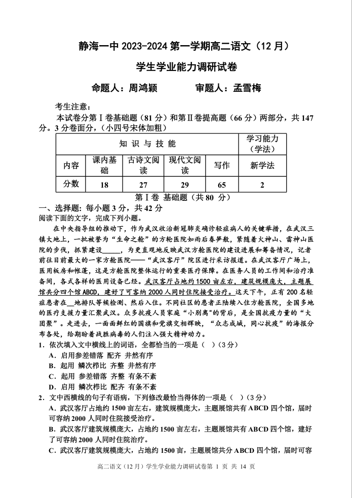 天津市静海区第一中学2023-2024学年高二上学期12月月考语文+答案