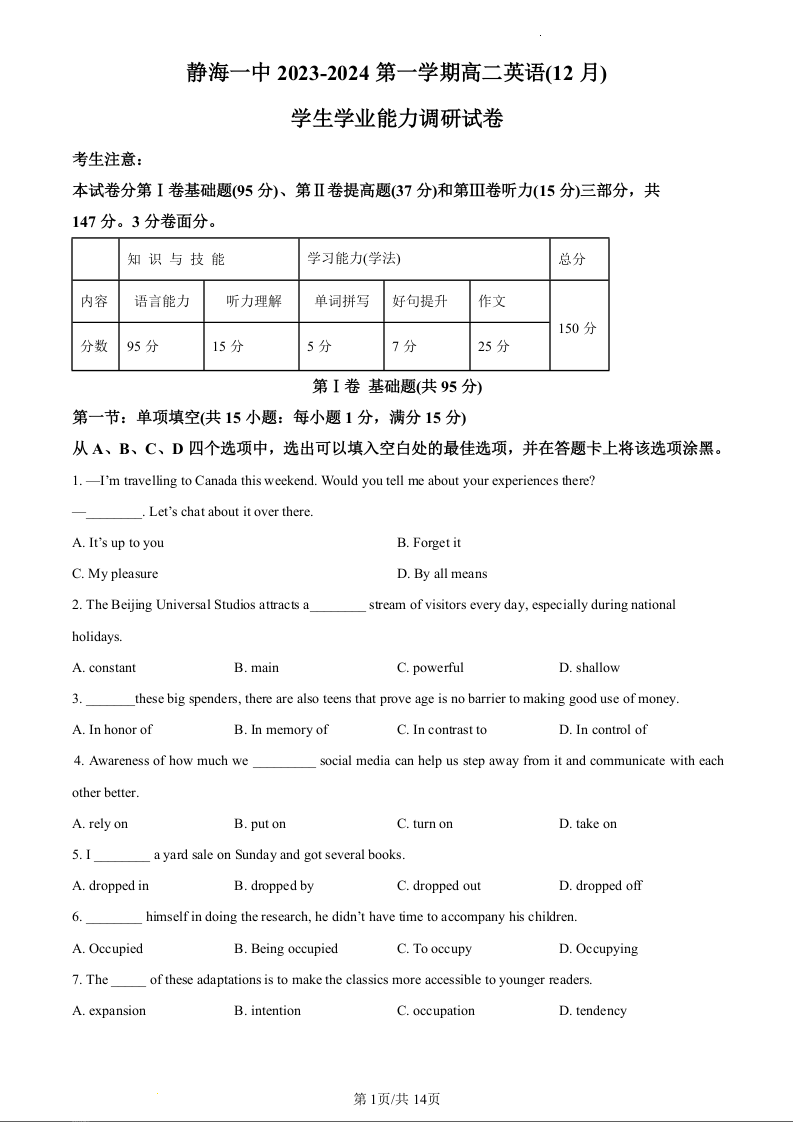 天津市静海区第一中学2023-2024学年高二上学期12月月考英语(原卷版)