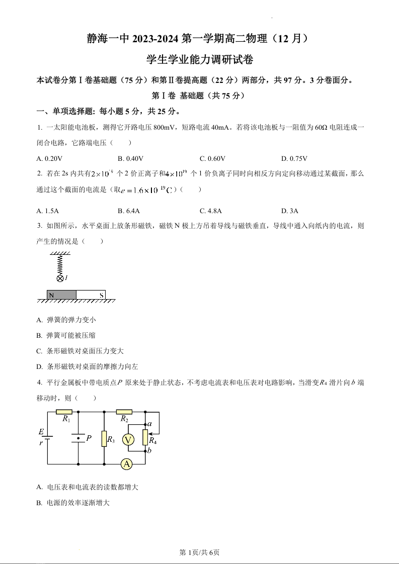天津市静海区第一中学2023-2024学年高二上学期12月月考物理(原卷版)
